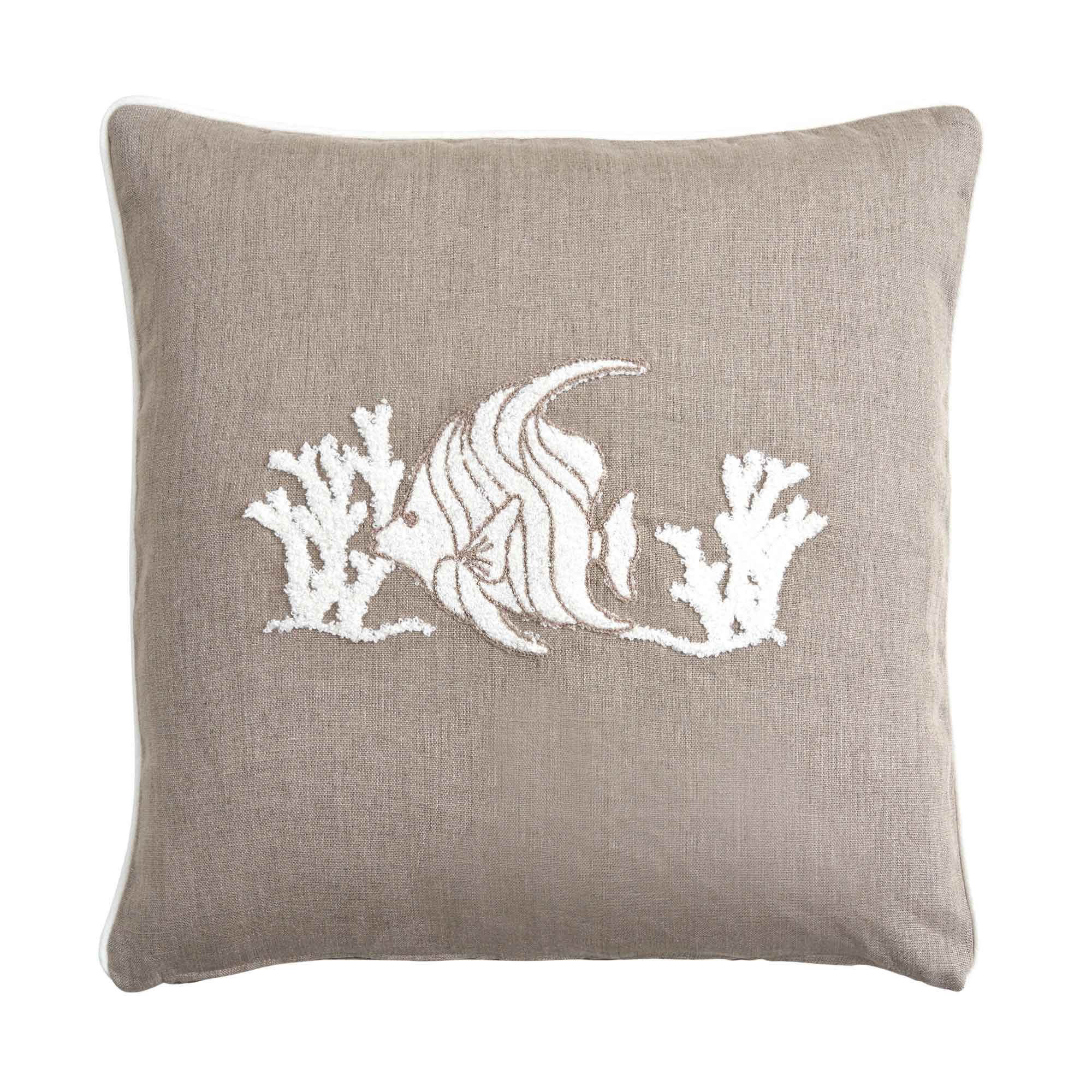 Cuscino ricamato quadrato decorativo in lino color tortora con disegno pesce bianco; cuscino ricamato dalla dimensione 45×45 cm, venduto compreso di interno in spugna.