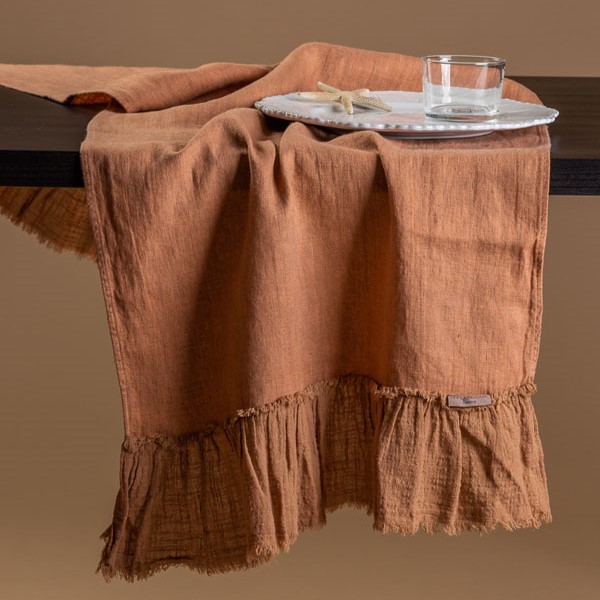 Runner tavolo arancione, per arredare con stile la tua tavola, dimensione 50x150cm. Runner in lino con rouches in stile shabby chic, utile accessorio per completare la tua tavola.